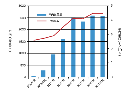 年内出荷領と単収の推移(系統実績)