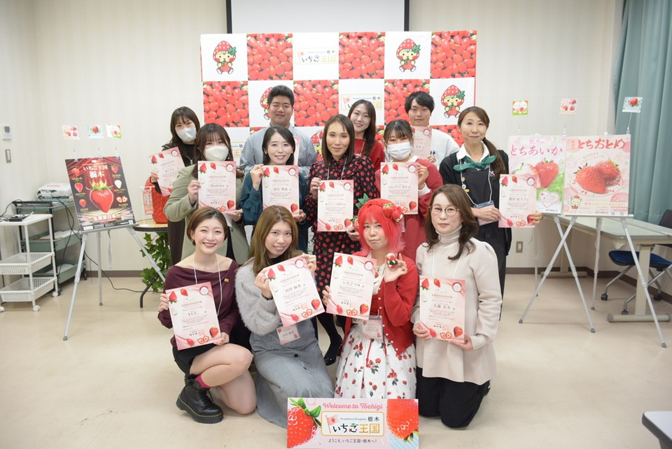 令和7年度の「いちご王国」アンバサダーは、県内外から16名の方に委嘱し、県農業総合研究センターいちご研究所(栃木市)において委嘱状の授与を行いました。