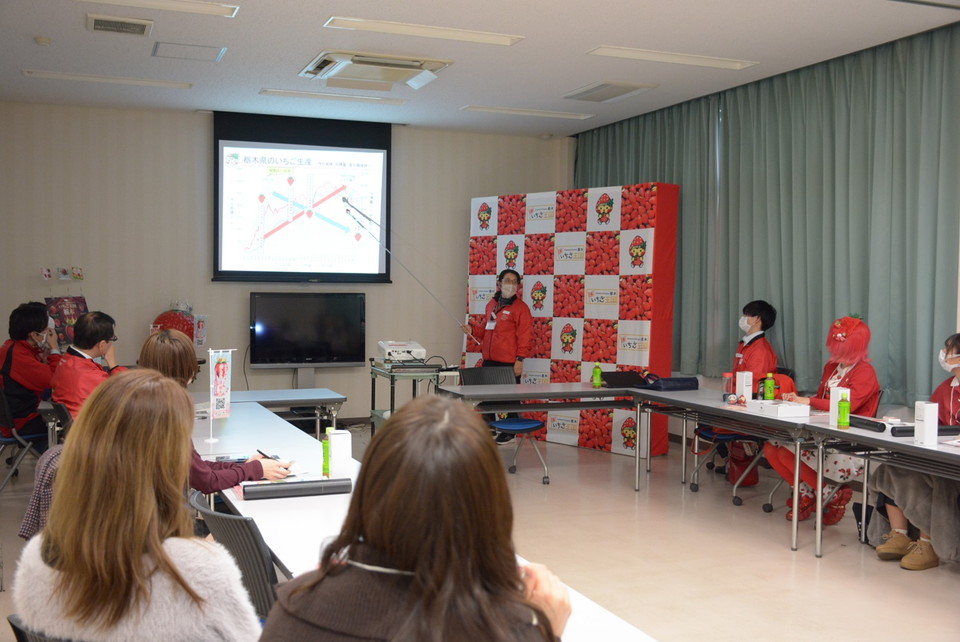 委嘱式後には、いちご研究所の職員から新品種開発の取組や栃木のいちごに関する説明が行われ、アンバサダーの皆様には本県が「いちご王国」である所以を知っていただけたと思います。