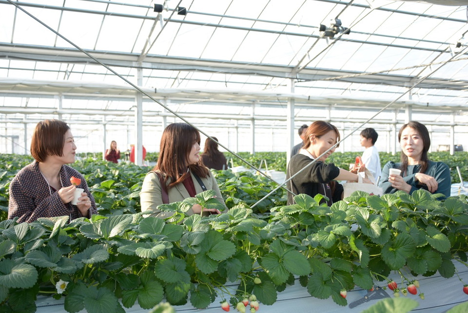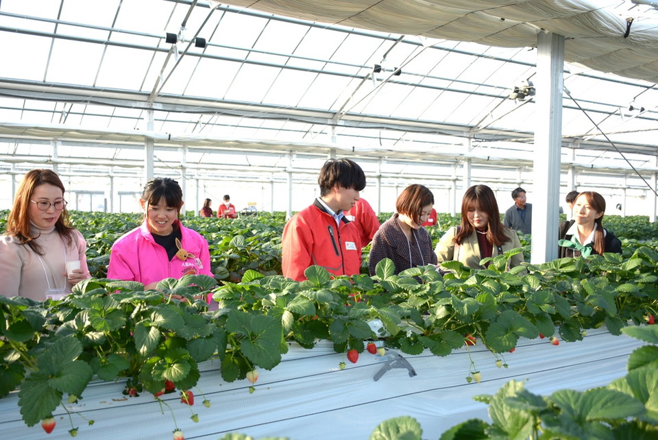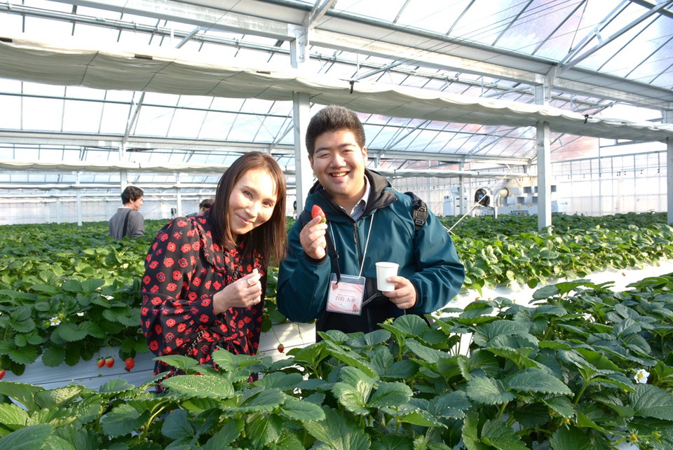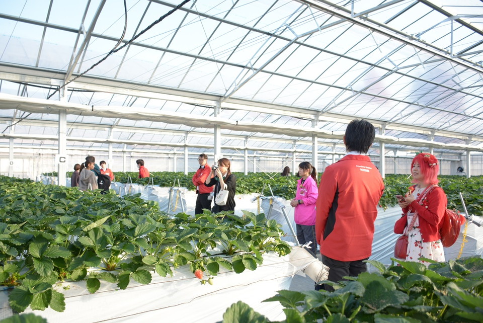 その後、いちごの里ファーム(小山市)に移動し、いちごハウスでとちあいかやスカイベリーのいちご狩りを行いました。ハウスの中に入るといちごの甘い香りが漂い、アンバサダーからは甘くて美味しいと言った声をいただきました。