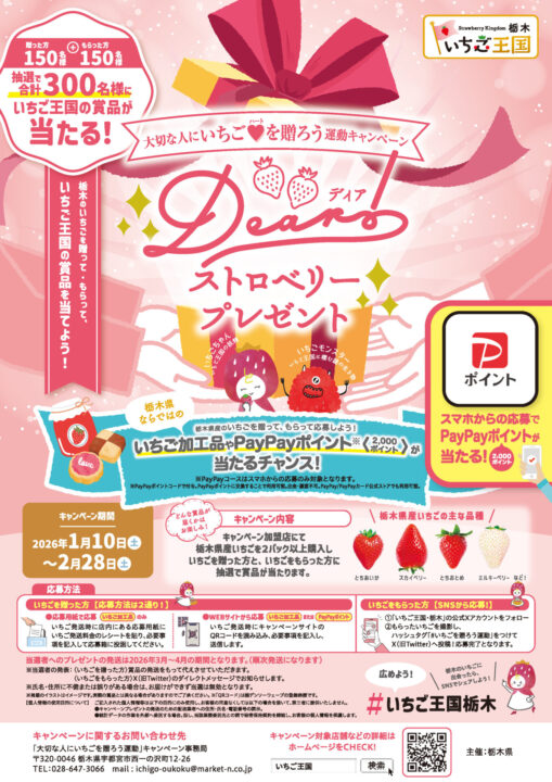 キャンペーン対象店舗にて県産いちご(とちあいか、とちおとめ、スカイベリー、ミルキーベリー等)を2パック以上購入し、宅配便でいちごを贈った方と、いちごをもらった方双方に抽選で景品が当たります。