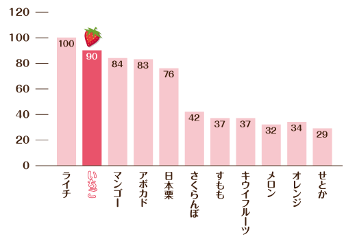 胎児の神経管は、多くの方が妊娠に気づいていないごく初期の時期にできあがるため、妊娠を迎える前から、日々の食生活でも一定量の葉酸を摂り続けている必要があるのです。葉酸は胎児の正常な発育に寄与するだけでなく、赤血球の形成やDNA合成に関わるため、男女とも全ての世代の人にとって必要な栄養素です。 食生活で葉酸を摂る際に、食品に含まれる葉酸には加熱や調理による損失が大きいという特徴があります。そこで、手軽に生のまま葉酸を摂ることができる果物…とりわけ「いちご」は優秀な果物だと考えられます(図表参照)。 葉酸を意識しながら、ぜひ家族揃っていちごを召し上がってみてはいかがでしょうか?